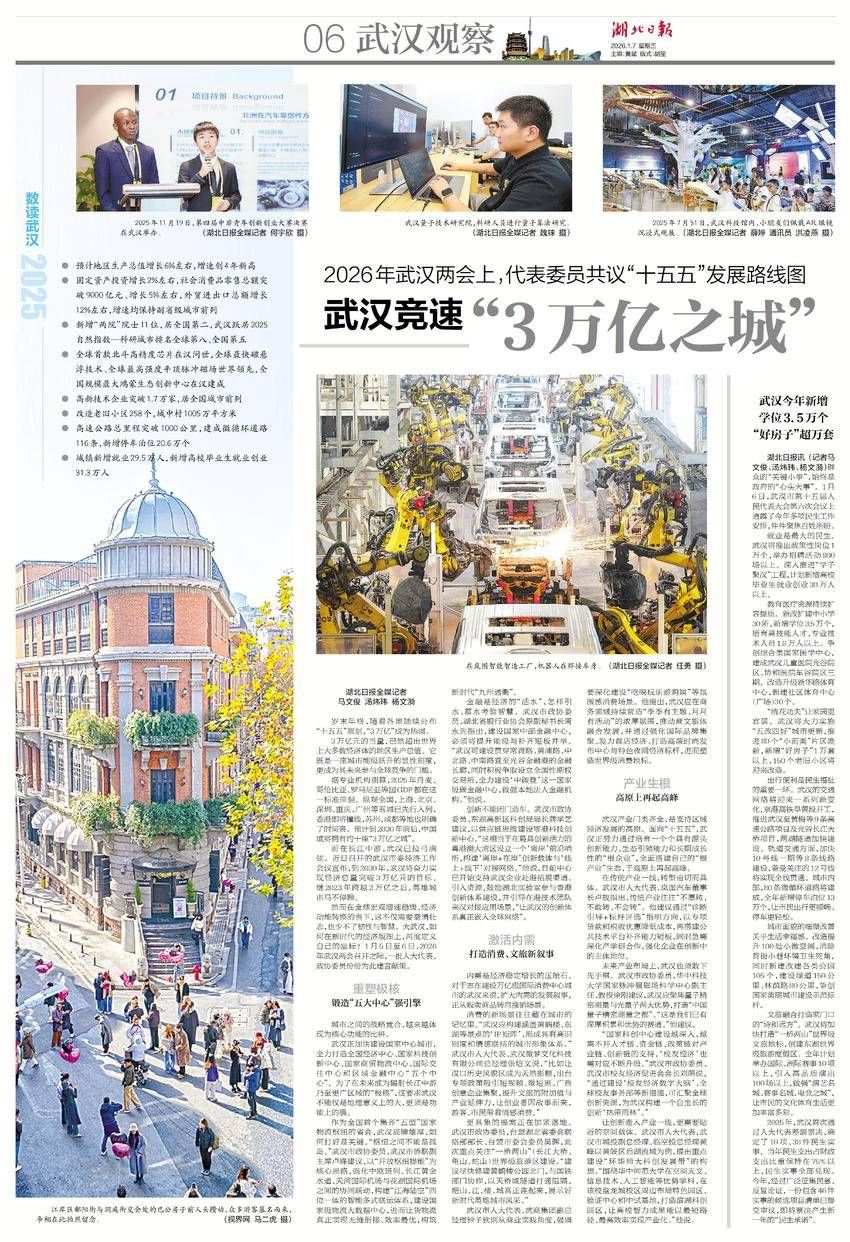然而在全球宏观增速趋缓、经济动能转换的当下,这不仅需要豪情壮志,也少不了韧性与智慧。大武汉,如何在新时代的经济版图上,再度定义自己的坐标?1月5日至6日,2026年武汉两会召开之际,一批人大代表、政协委员纷纷为此建言献策。