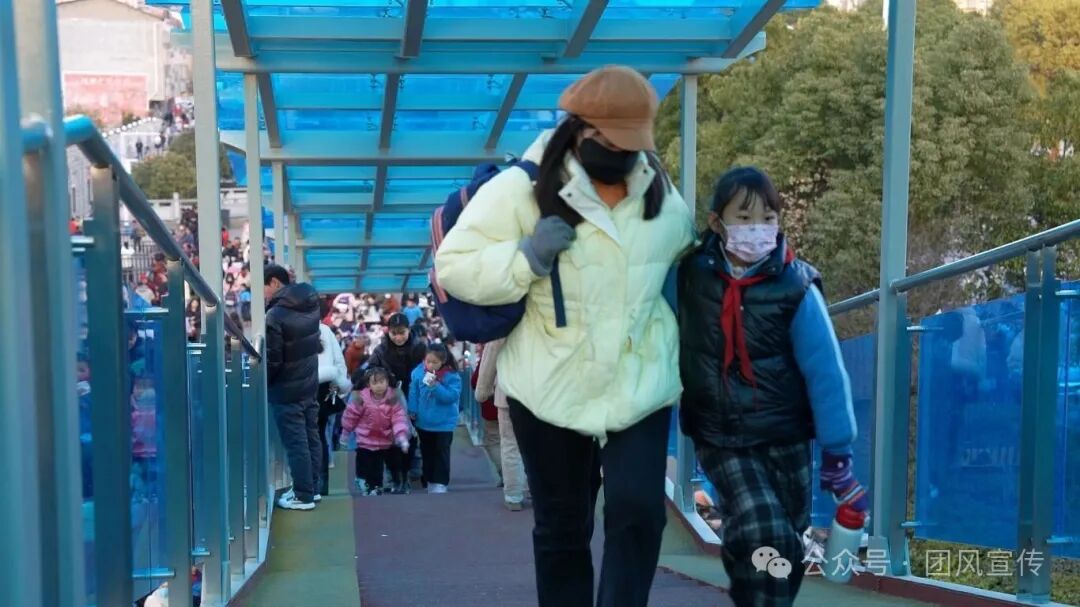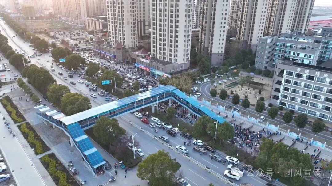 迎宾大道作为团风城区核心交通干道,车流量大、人口密集。下午临近5点,正值思源小学放学时段,一座钢结构人行天桥飞架南北,成为师生通行的重要安全通道。该天桥实现人车彻底分流,从根源消除师生过街隐患,学生无需与车流“抢时间”。同时,衔接停车场的布局优化了交通接驳环境,让家长接送更安心,大幅降低交叉通行引发的事故风险。
