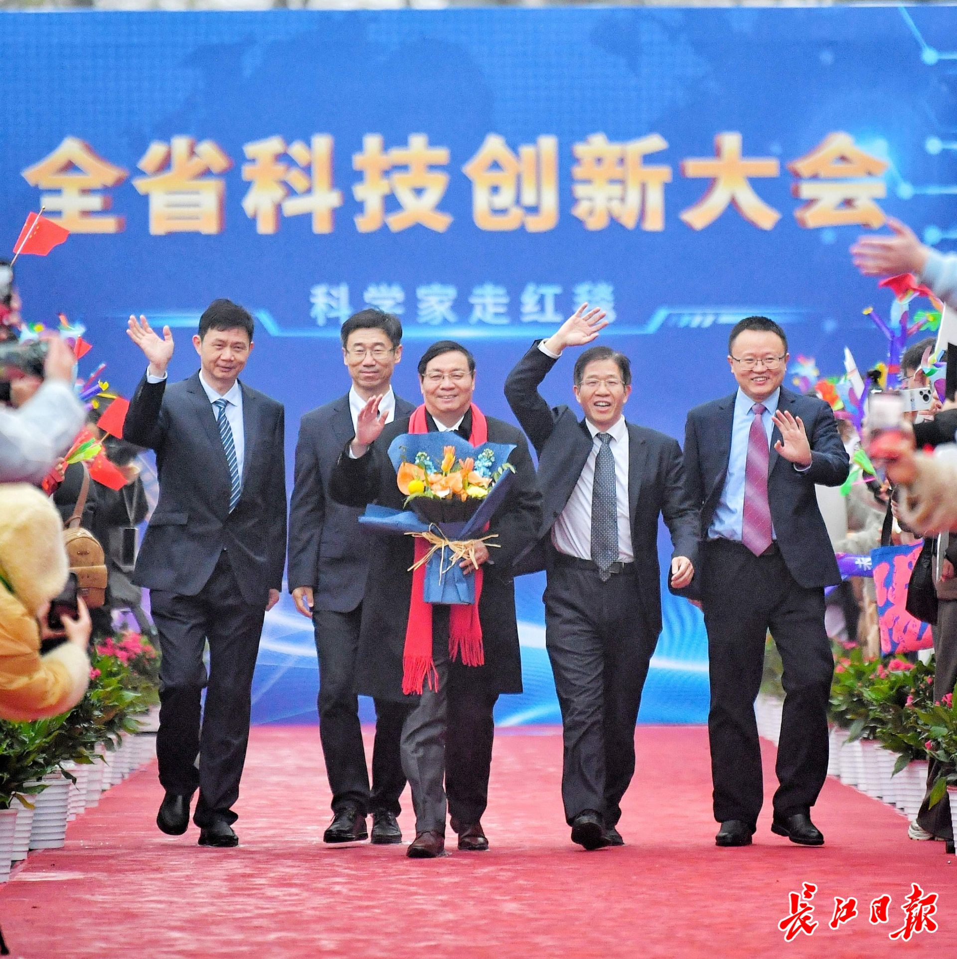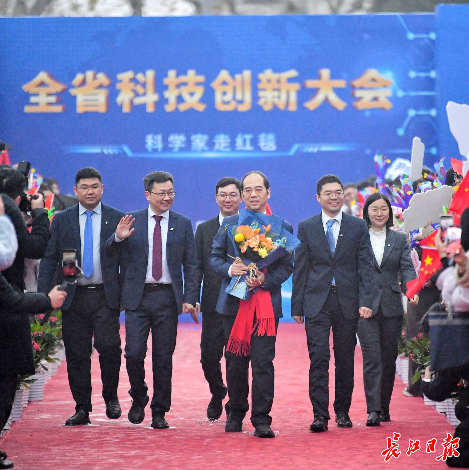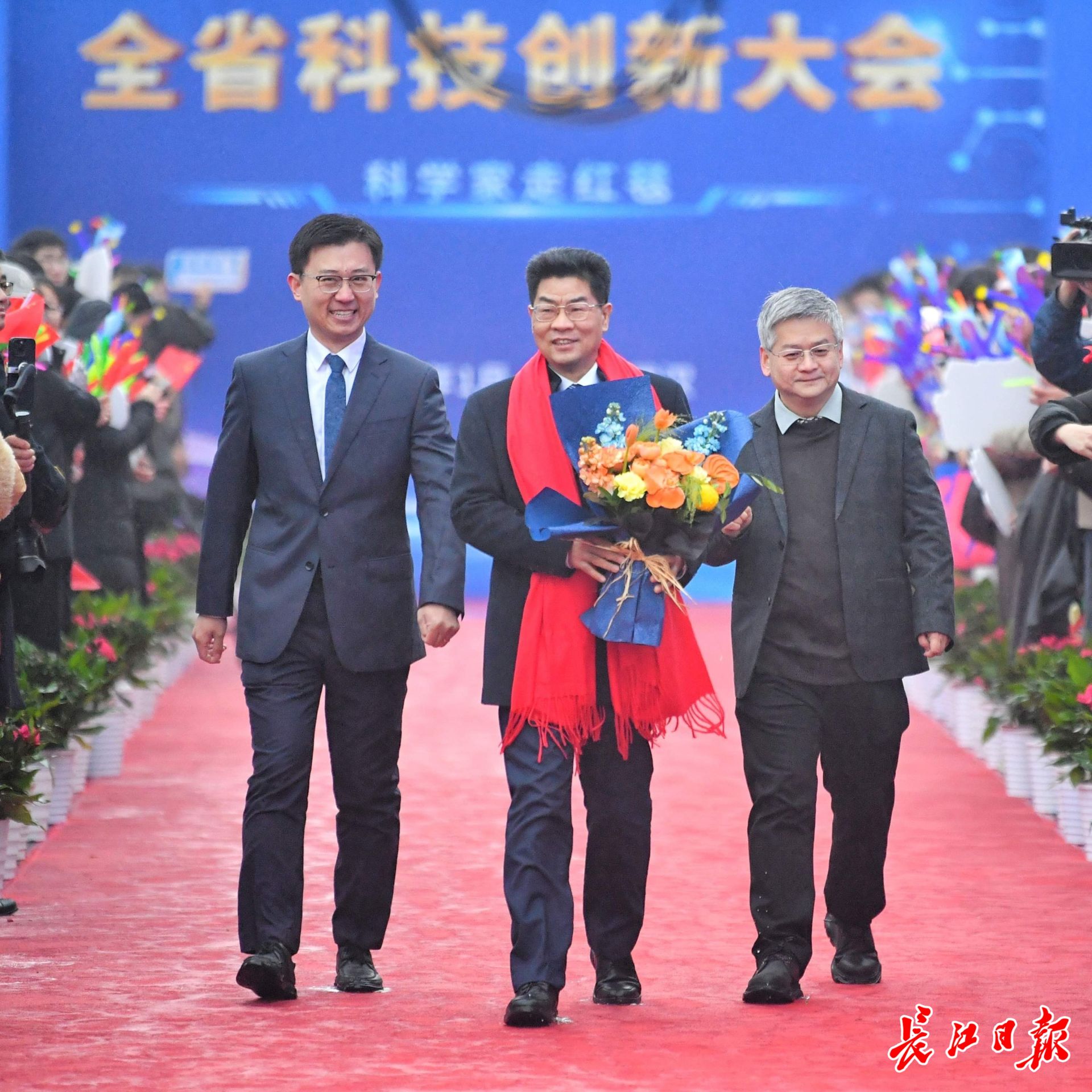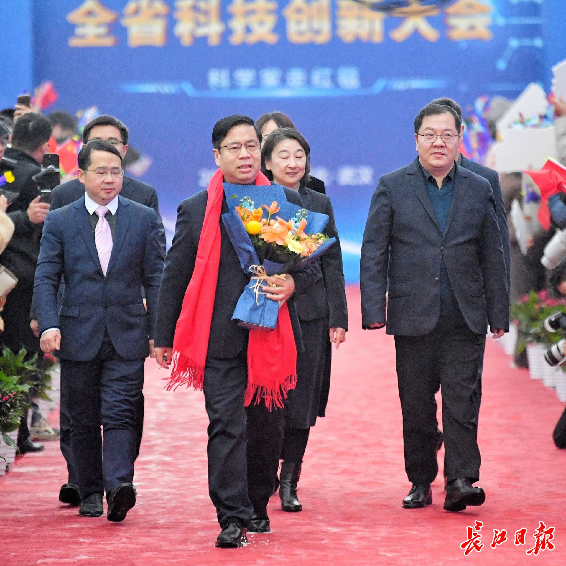 华中科技大学丁烈云院士(持花束者)走上红毯。
