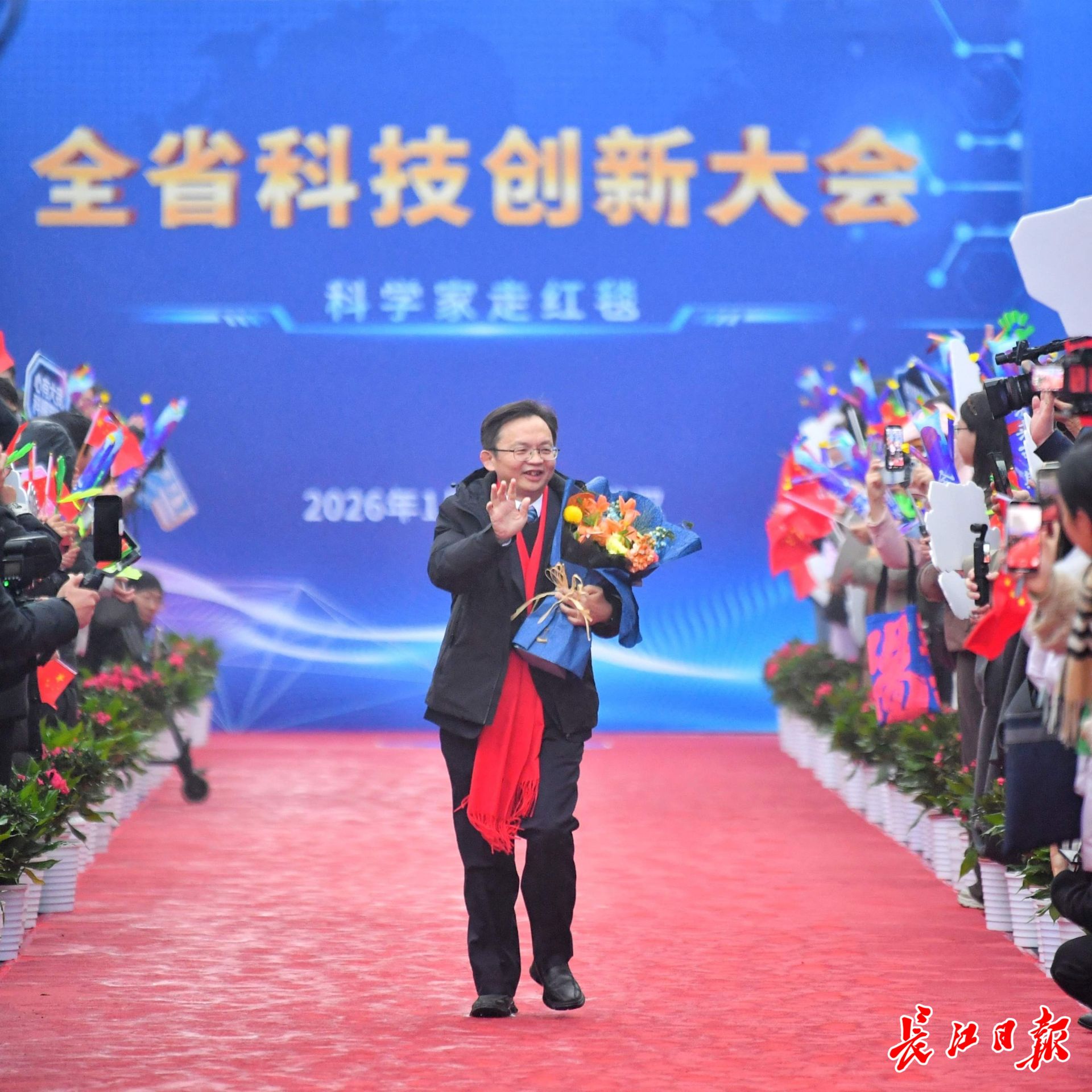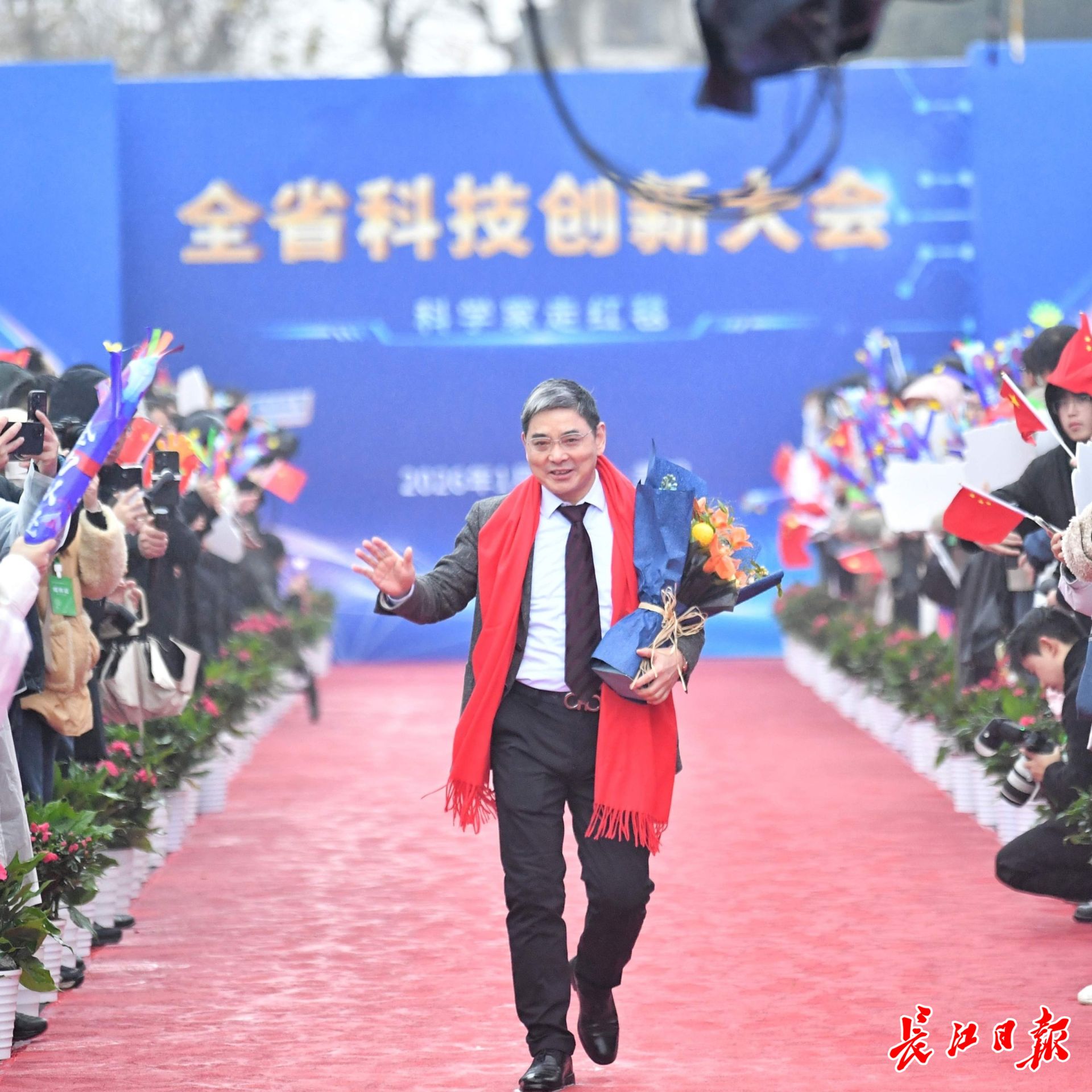长江日报大武汉客户端1月4日讯 1月4日,湖北省科技创新大会在武汉举行。举办大会的洪山礼堂外,一条百米红毯铺就星光大道,在鲜花簇拥中,12位“科学之星”款步而来。这已是湖北省科技厅“科学家走红毯活动”第七年绽放荆楚,见证着湖北科技创新的蓬勃脉动。