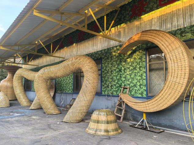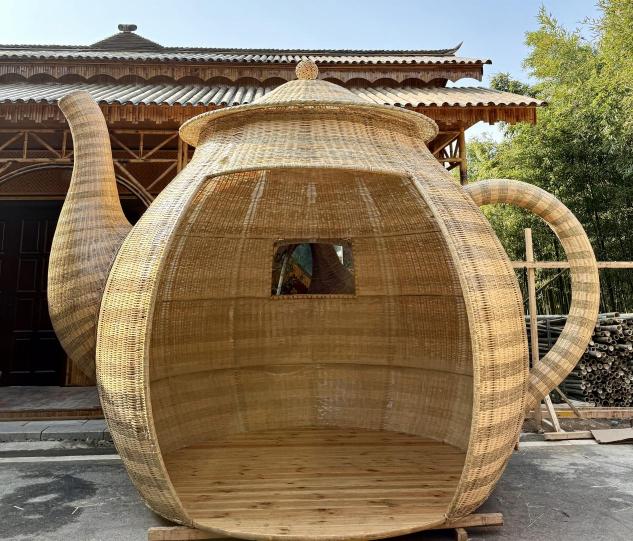 就在众人一筹莫展时,厂长章师傅提议:去羊楼洞试试做“竹编景观”!于是两米多高的竹茶壶,竹花瓶应运而生,大件竹编内部摆上桌椅,可供游客休憩:一米宽两米多长的竹长凳,竹靠椅错落摆放,自成风景。2025年国庆长假,羊楼洞人山人海,庞超带队守在竹编景观旁细致观察。没想到,游客们排着长队钻进竹茶壶,竹花瓶里歇脚、喝水、吃零食,所有的竹子坐具座无虚席,反倒冷落了景区的石板长凳。