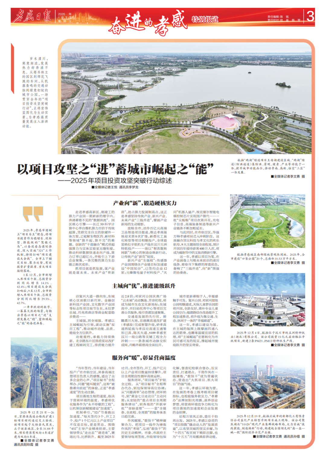 2025年,孝感牢固树立“项目为王”理念,将项目投资作为稳增长、促转型、强能级的“驾辕之马”,以奋进姿态谋划推进,深入实施“321”工作机制,持续打响“项目建设大会战”。全市上下锚定目标、聚力攻坚,有效投资扩量提质、重大项目接续落地。