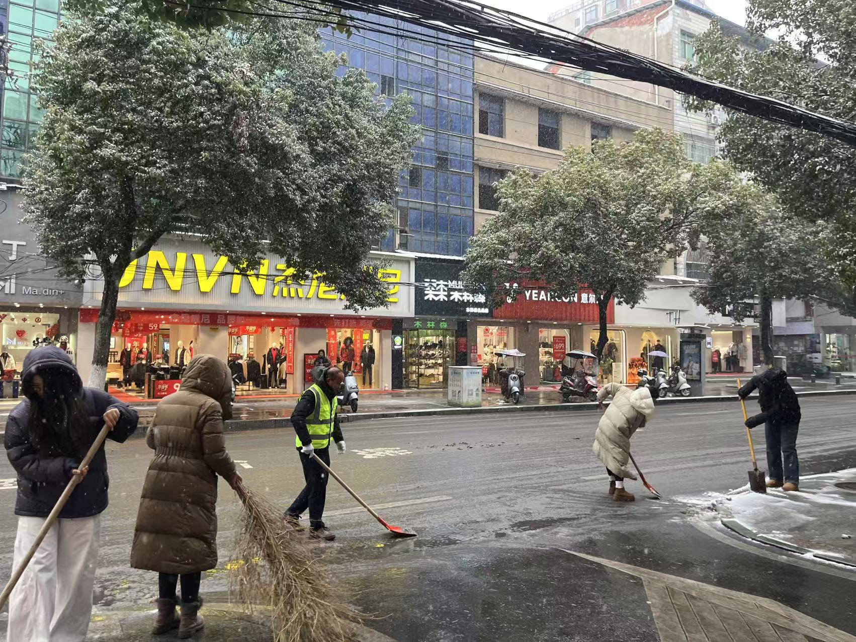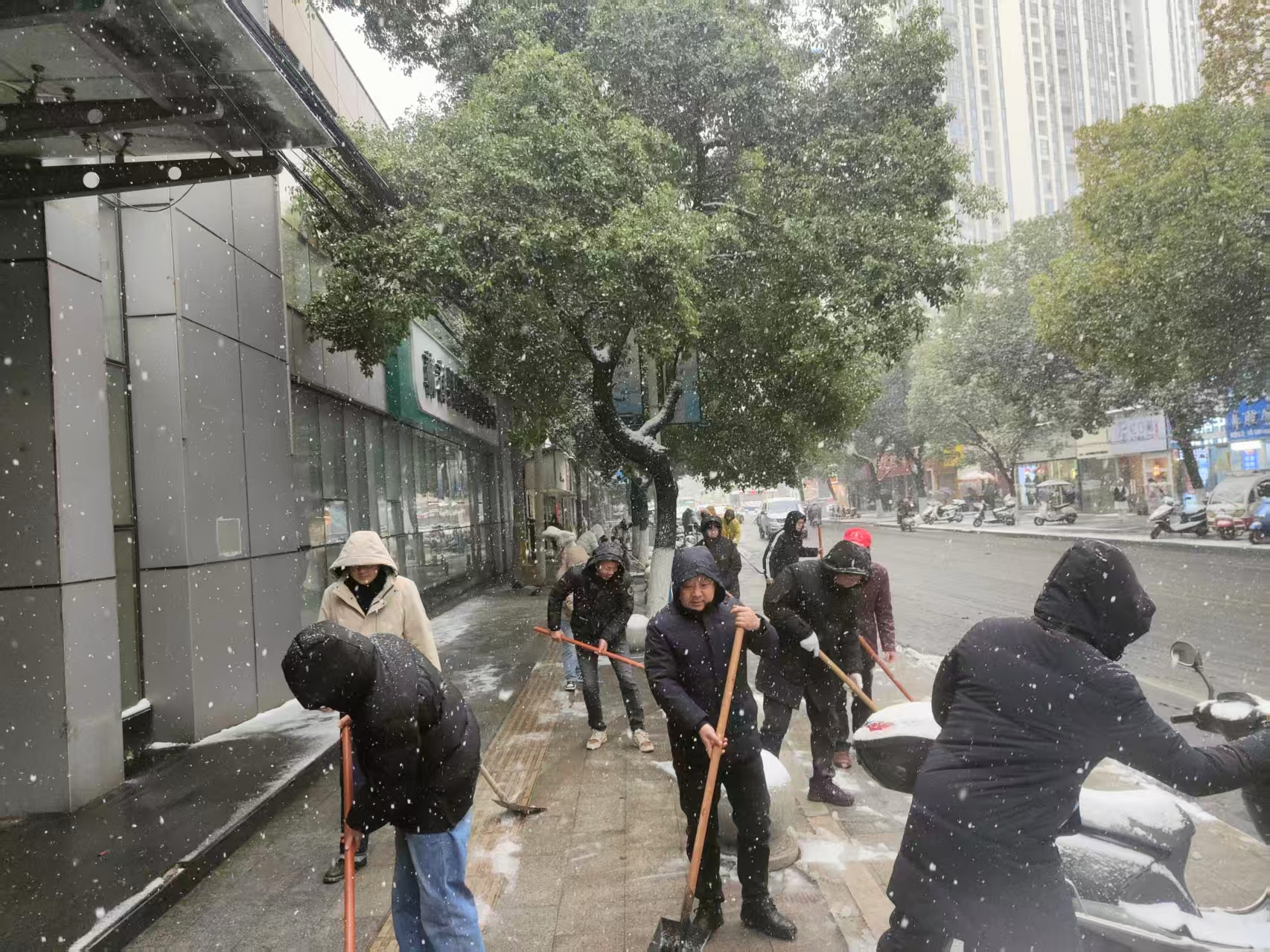 县供销社组织干部职工铲冰除雪,保障市民出行安全通畅。