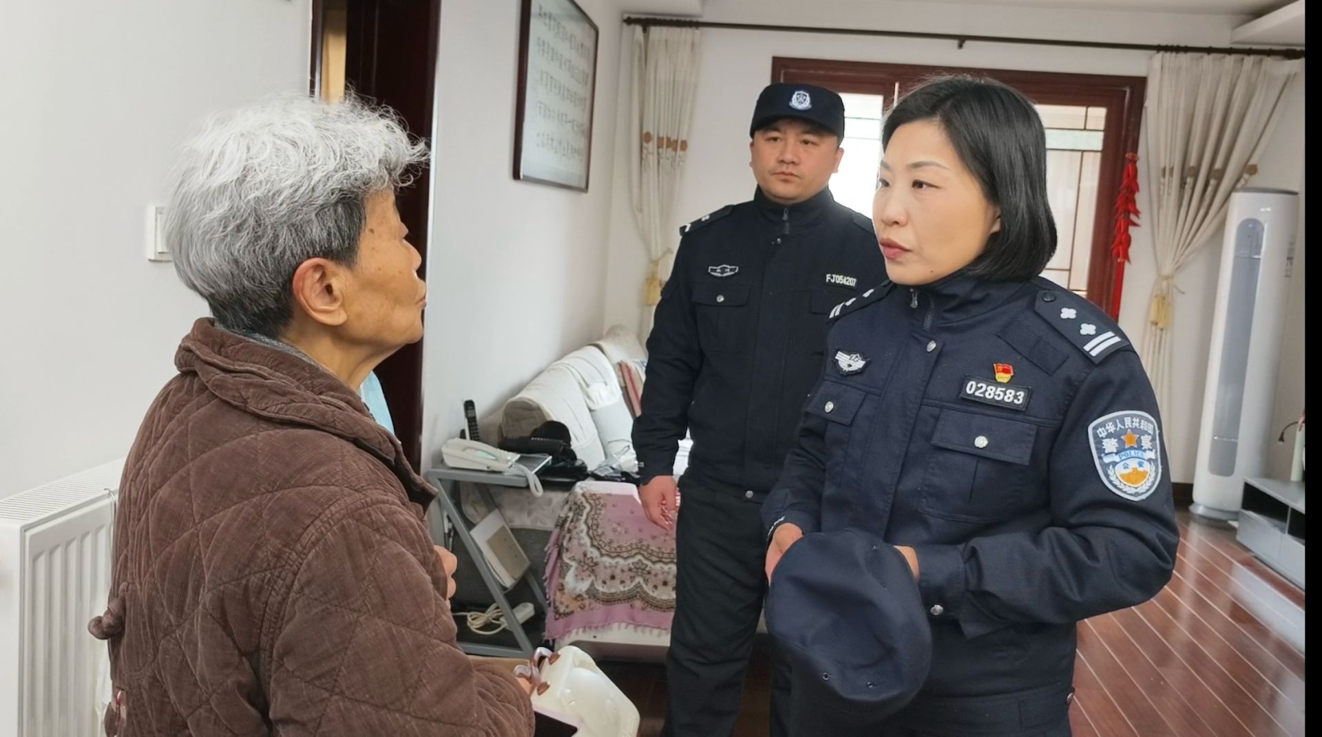 分享的喜悦还未褪,邵楠和海工社区网格员喻奕钦便拎起提前准备的米油、坚果和春联,直奔海工社区83岁独居老人宋显新家中——这是她在北京时就心心念念的牵挂。"宋奶奶,我回来啦!给您带了春晚现场的福气!"邵楠轻轻敲门,门刚打开就被宋显新一把拉了进去。"孩子,你上新闻我都看了,穿着警服真精神!"老人拉着她的手坐在沙发上,翻看着邵楠手机里的照片,不时询问"现场冷不冷""有没有吃好"。邵楠一边应着,一边熟门熟路地检查起老人家中的燃气阀门和电路开关,又将门口积攒的快递包裹一一拆封:"这是您买的降压药,我帮您放在药盒里;这袋坚果,我给您分成小份,吃着方便。"她还顺手拿起抹布,把老人的茶几擦得干干净净,临走时反复叮嘱:"有任何事随时给我打电话,我这几天都会常来看看。"