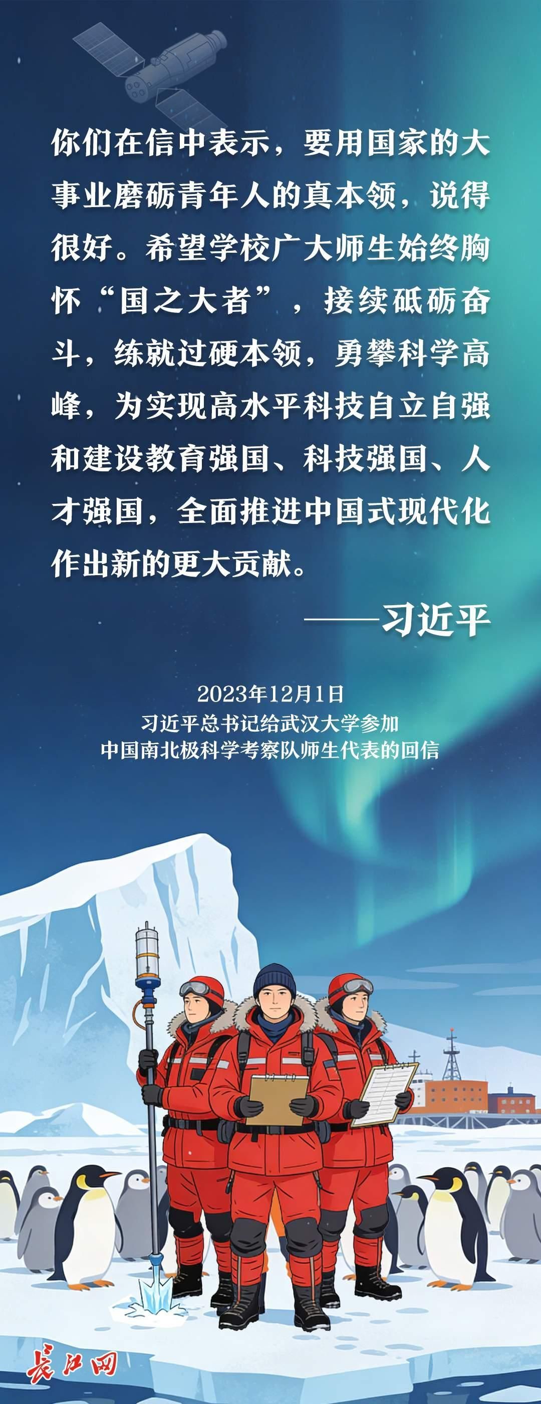 2023年12月1日,习近平总书记给武汉大学参加中国南北极科学考察队的师生代表回信,“希望学校广大师生始终胸怀‘国之大者’,接续砥砺奋斗,练就过硬本领,勇攀科学高峰,为实现高水平科技自立自强和建设教育强国、科技强国、人才强国,全面推进中国式现代化作出新的更大贡献”。