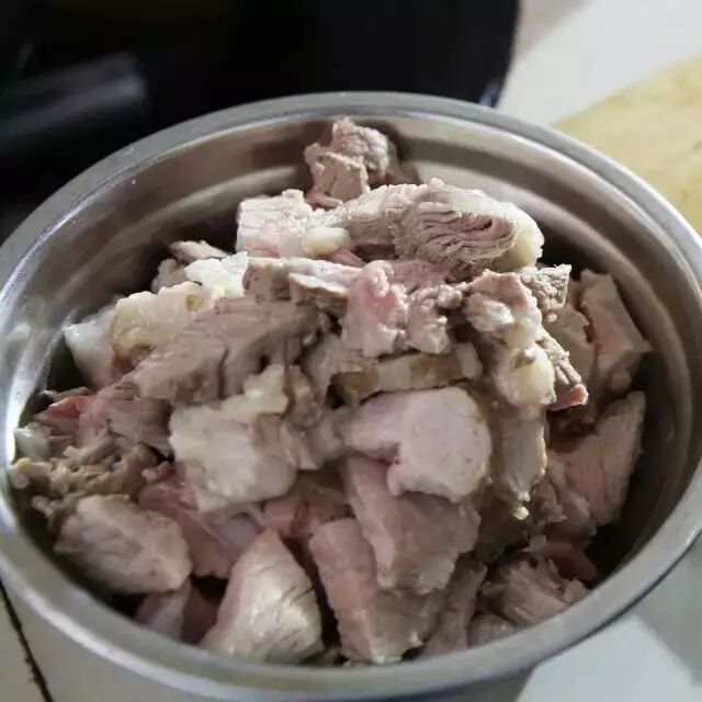 正宗朱冲蒸面不是用蒸笼蒸,而是直接用锅蒸,当然要用大块肉丁和大块萝卜丁垫在锅底,一是防止蒸面烤糊,二是萝卜的青气入味。