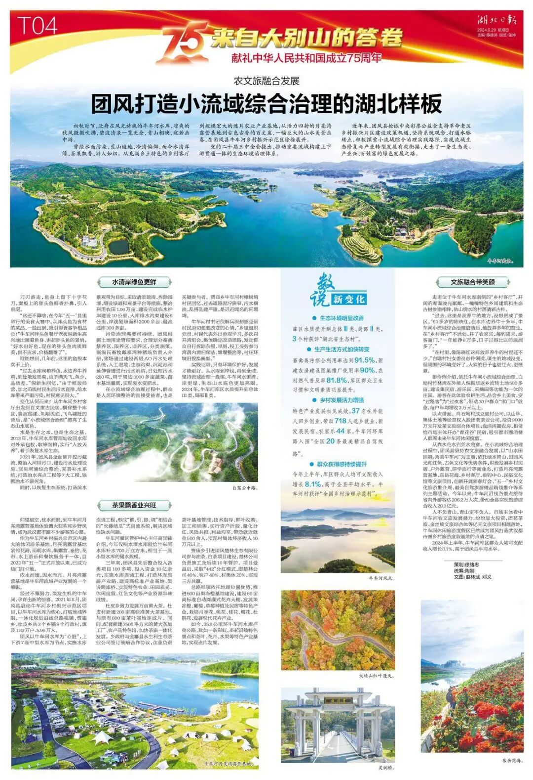 曾经水面污染,荒山遍地,冷清偏僻,而今水清岸绿,茶果飘香,游人如织。从充满乡土特色的乡村客厅到规模宏大的连片农业产业基地,从活力四射的月亮湾露营基地到古色古香的百丈崖,一幅巨大的山水美景画卷,在团风县牛车河乡村振兴示范区徐徐展开。