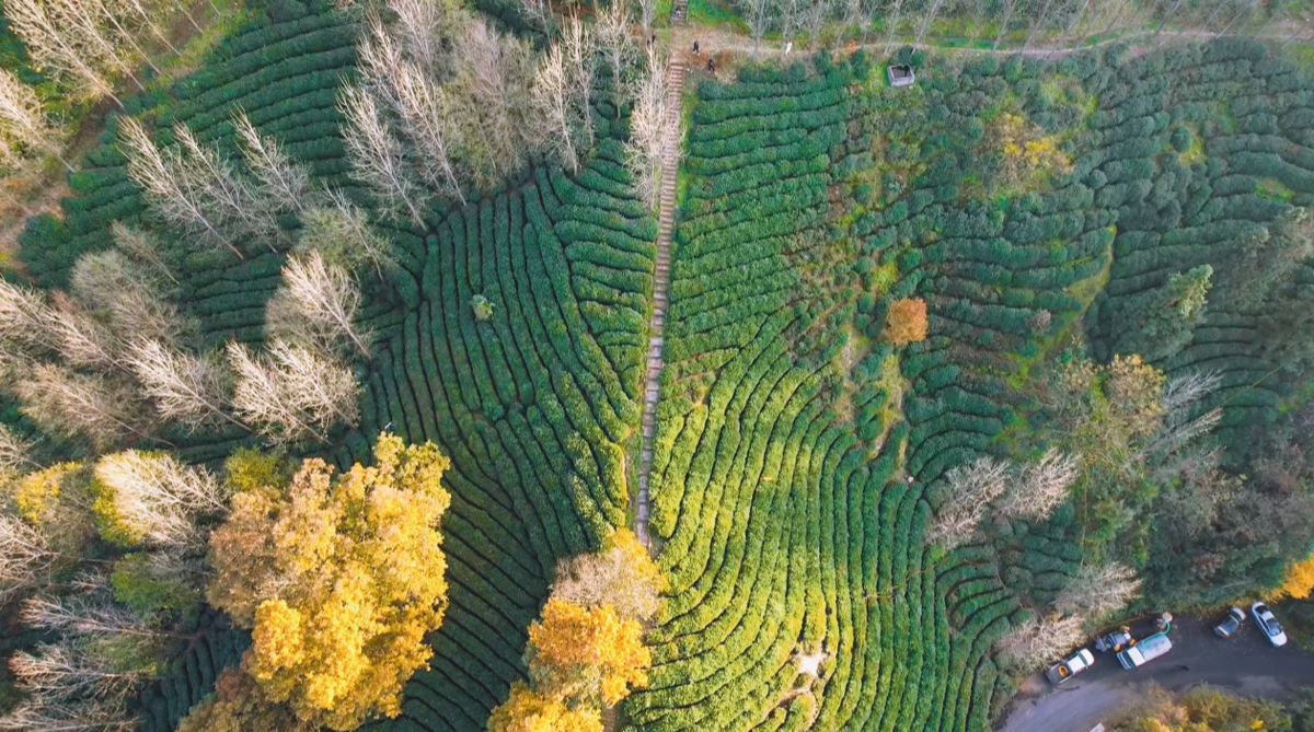 站在堰河村的山顶俯瞰,连片茶园如绿毯般铺展。