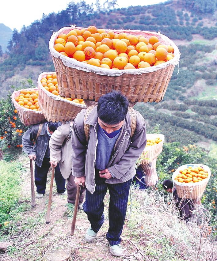 2007年12月,秭归郭家坝邓家坡,橘农用背篓艰难地将柑橘背出大山。