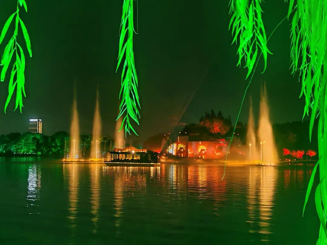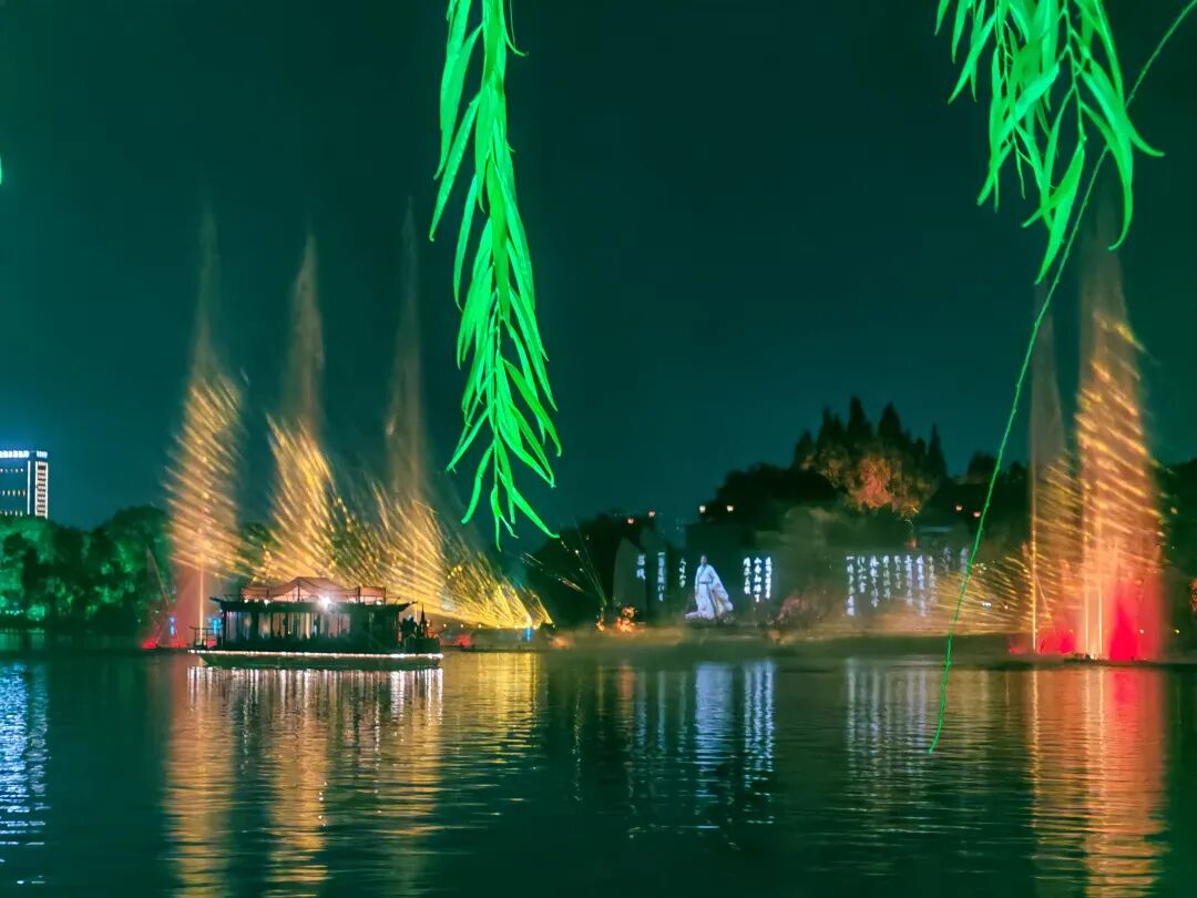 以“庭下如积水空明”为场景创意主题,打造40米长水上光影浮台,上设两处虚实结合的 1 万流明莎幕投影造景装置,联动两台4万流明九曲桥桥体mapping秀,形成户外水上剧场,还原夜游承天寺的美学场景。月光如水,竹柏影斑驳,游客乘船穿行其间,仿佛与苏轼、张怀民共赴那场千古夜游,在静谧中体悟“闲人”的豁达与通透。
