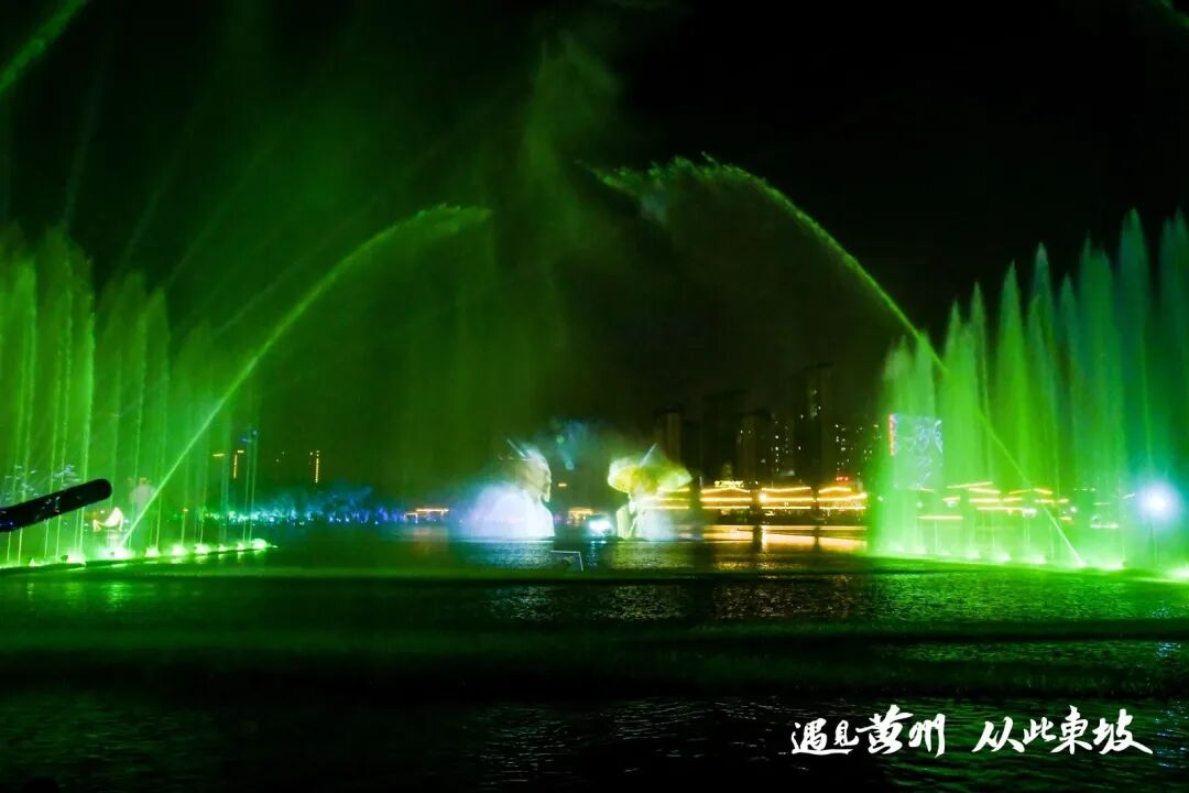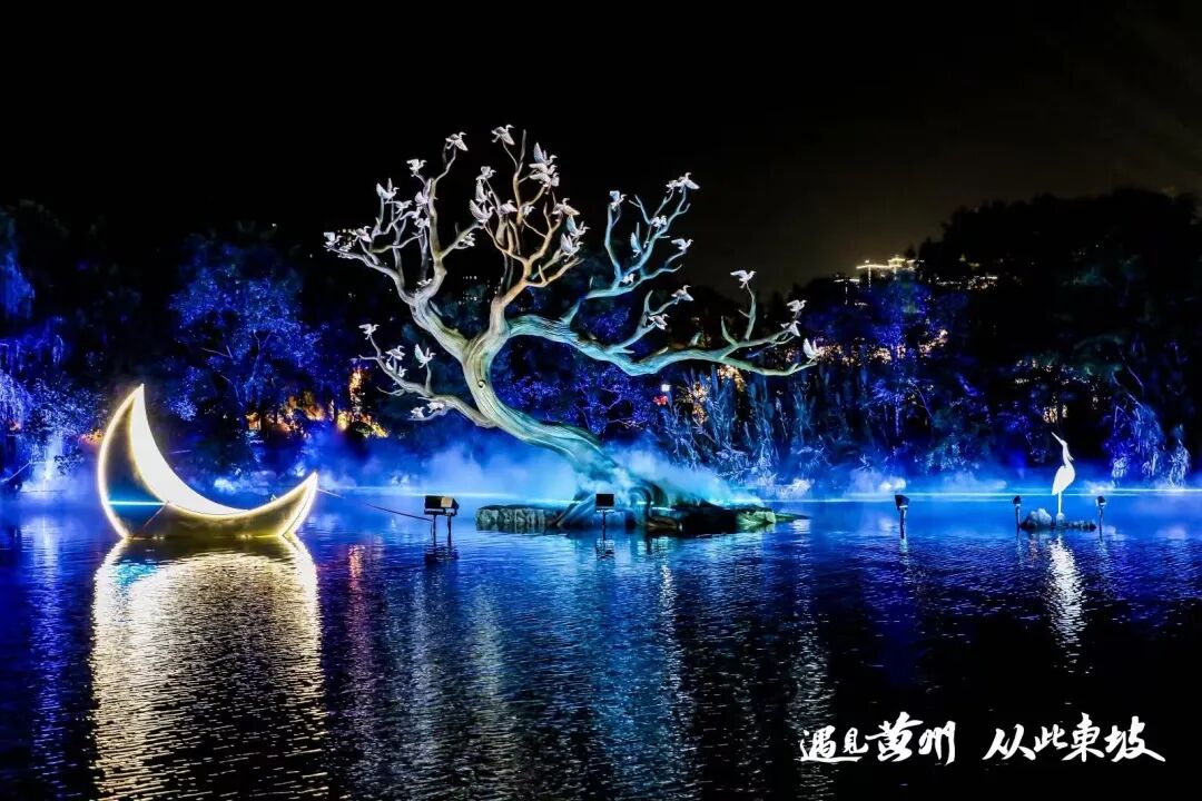 在夜幕低垂的遗爱湖公园,华灯璀璨,古风音乐悠扬。湖面上,游客乘宋风游船穿梭于光影交织、声画共鸣的湖面上,观赏飞天火壶、非遗打铁花、千灯映湖、宋韵飞天等特色表演,既可感触苏东坡的生活美学,更能与千年前的文坛领袖在精神上深度共鸣。湖岸边,千灯璀璨,万树“花”开,来自全国各地的游客摩肩接踵,悠闲地漫步其中。