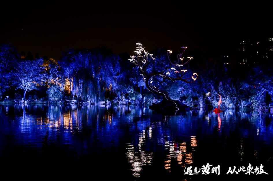 以“拣尽寒枝不肯栖,寂寞沙洲冷”为场景创意主题,12米高15米长水上发光造型神树装置、5.3米长5.2米高 3 米宽的电动伴游月亮船、一组高2米孤鸿装置与45组光影飞鸟装置,还原寂寞沙洲冷的意境,配合明暗交替如呼吸般的光影韵律,精准还原苏轼谪居黄州初期的孤寂,体验其“惊魂不定”的“惊鸿”时刻。