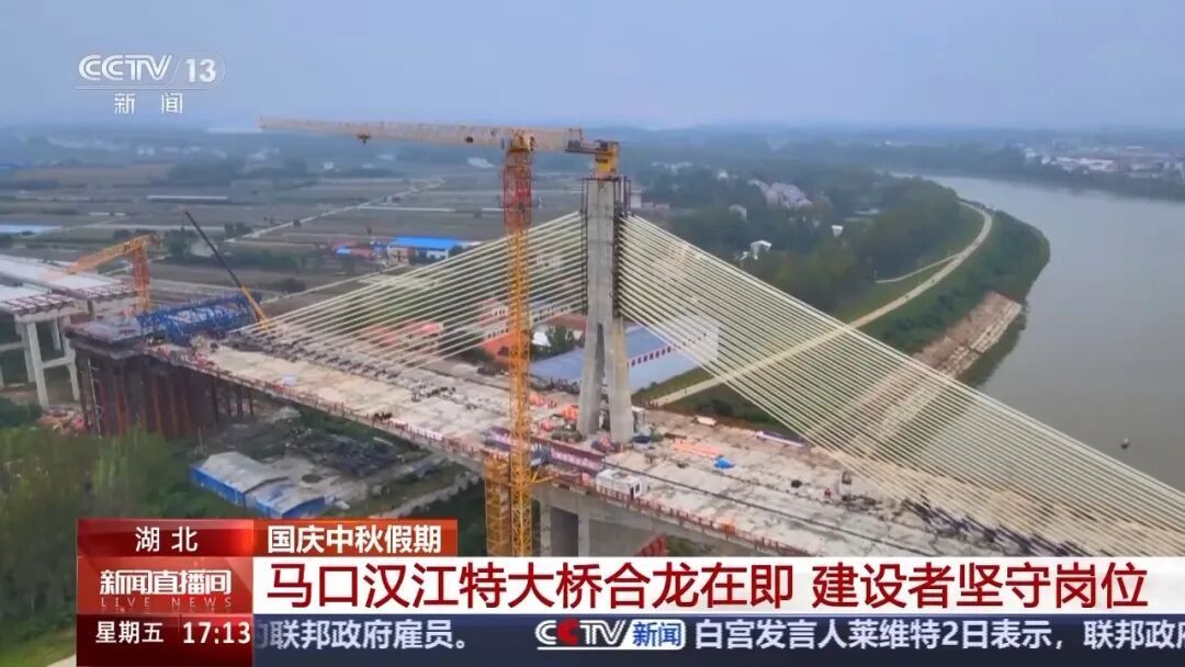 重点工程建设者以坚守诠释担当,登上《朝闻天下》。10月3日至4日,央视新闻频道《新闻直播间》《午夜新闻》三度播出《湖北:马口汉江特大桥合龙在即 建设者坚守岗位》,报道汉川武天高速项目200多名建设者假期奋战一线。这座全长570米的大桥是武汉至重庆高速的关键节点,通车后武汉至天门车程将缩短至1小时。