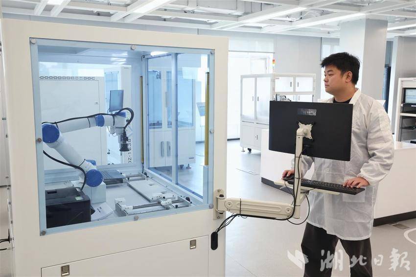 星汉实验室内,工作人员通过六轴机械臂模拟用户的真实操作,进行人机交互测试。(湖北日报全媒记者 陈少哲 摄)