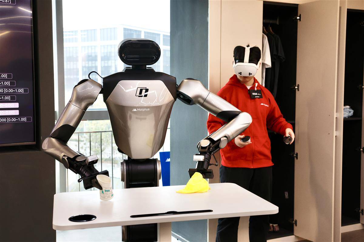 在签约当天的开放体验环节,记者穿戴VR设备进入虚拟世界,亲身引导机器人学习。当记者在虚拟超市从货架上取下饮料时,现实中的机器人立刻“秒懂”,同步完成取物动作;在虚拟卧室,记者叠好被子,机器人随即将被子折成整齐的“豆腐块”。
