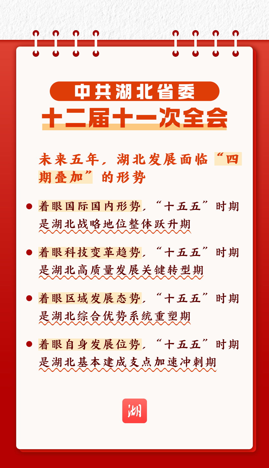 11月21日,中国共产党湖北省第十二届委员会第十一次全体会议在武汉举行。 会议对未来五年湖北经济社会发展工作作出全面系统部署。“十五五”时期湖北怎么干,支点建设取得何种成效? 收藏这份学习笔记,勇担使命,奋发进取! 来源:湖北日报融媒体中心