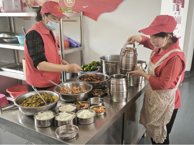 高山村幸福食堂的志愿者正为行动不便的老人准备可口午餐