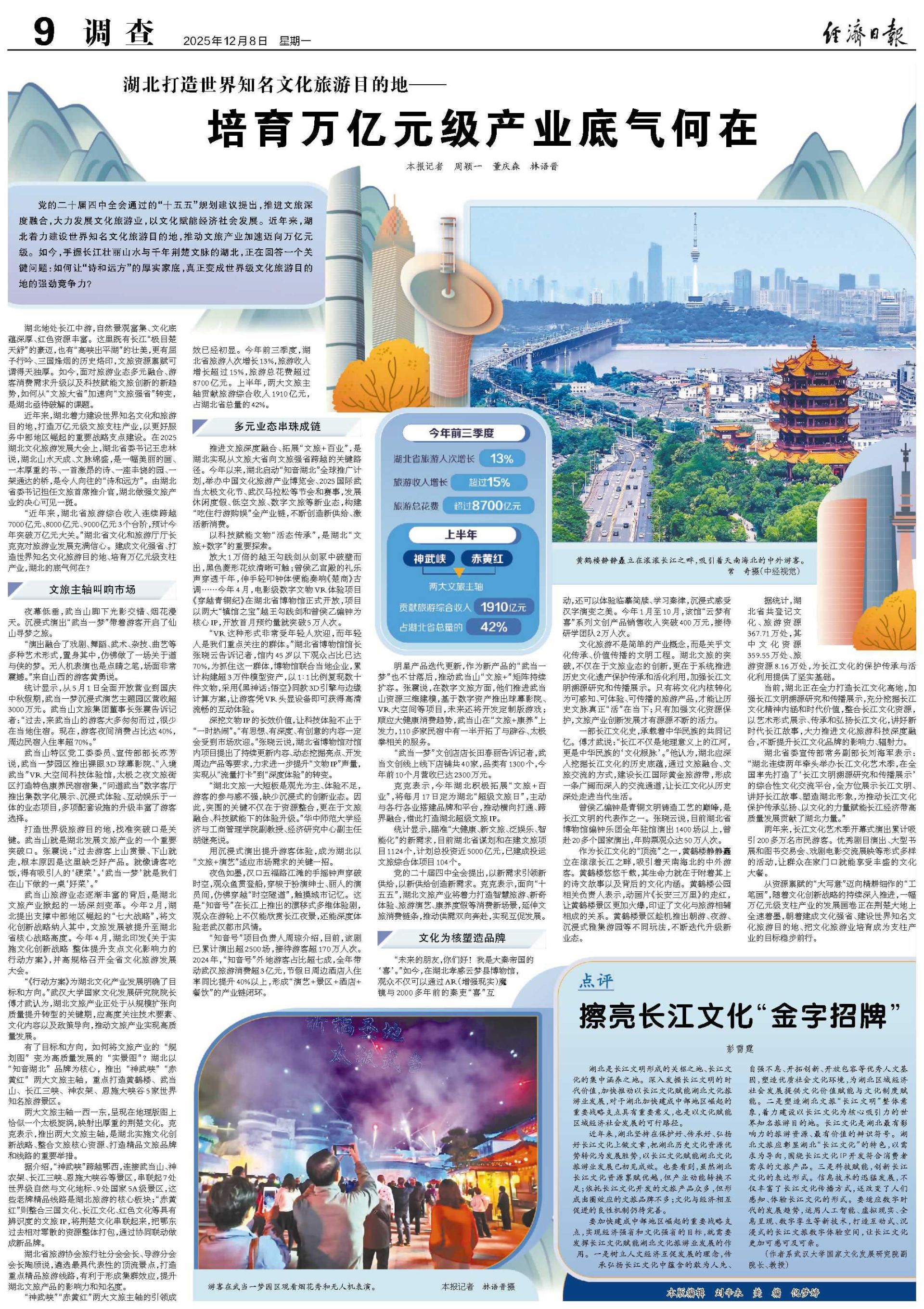 党的二十届四中全会通过的“十五五”规划建议提出,推进文旅深度融合,大力发展文化旅游业,以文化赋能经济社会发展。近年来,湖北着力建设世界知名文化旅游目的地,推动文旅产业加速迈向万亿元级。如今,手握长江壮丽山水与千年荆楚文脉的湖北,正在回答一个关键问题:如何让“诗和远方”的厚实家底,真正变成世界级文化旅游目的地的强劲竞争力?